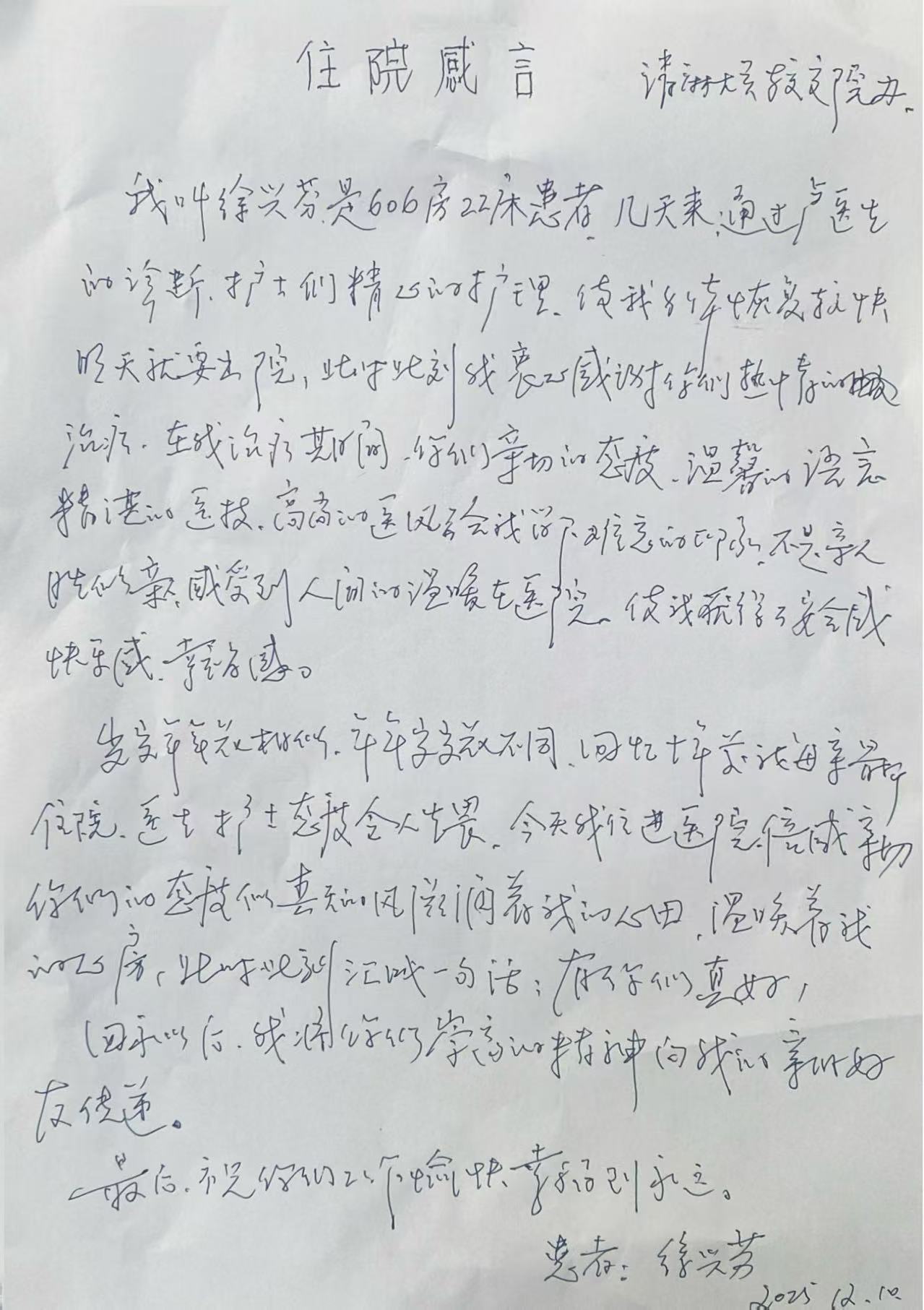 12月10日上午,安陆市普爱医院肾内科医生办公室内暖意融融,一位老爷爷将亲手书写的《住院感言》送到管床医生卢瑞雪手中,朴实的文字里满含对医护人员的感激之情。