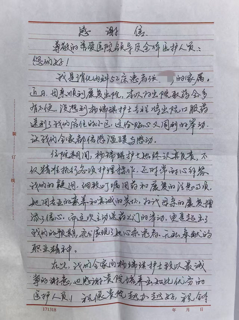 近日,安陆市普爱医院消化内科收到了一封情真意切的感谢信,写信人是52床患者张奶奶的家属周女士。