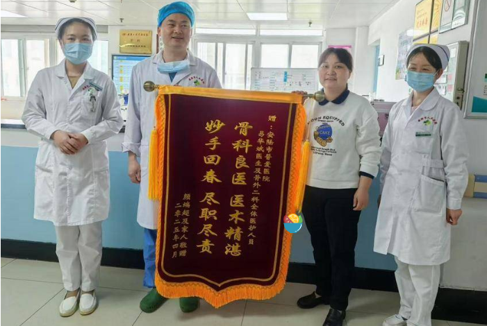 4月21日,安陆市普爱医院骨外二科上演了一幕感人场景:患者颜爹爹、徐婆婆女儿将一面锦旗和一封饱含深情的感谢信送到医护人员手中,用最真挚的方式表达对易华斌医生团队及科室全体医护人员的感激之情。