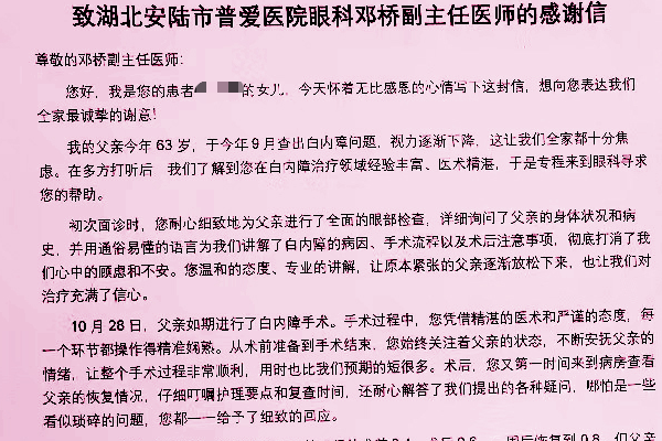 近日,安陆市普爱医院眼科收到一封来自患者蔡先生女儿的感谢信。
