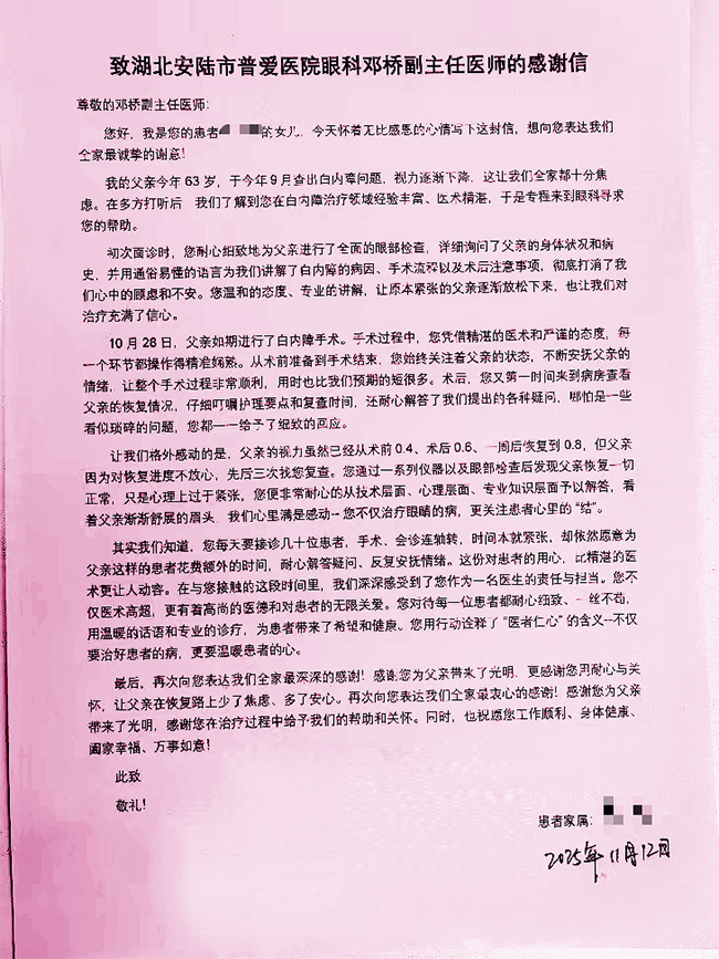 近日,安陆市普爱医院眼科收到一封来自患者蔡先生女儿的感谢信。信中,蔡先生女儿满含感激,详细讲述了眼科邓桥副主任医师为其父亲治疗白内障的全过程,字里行间满是对邓桥医师精湛医术、高尚医德的崇敬与谢意。