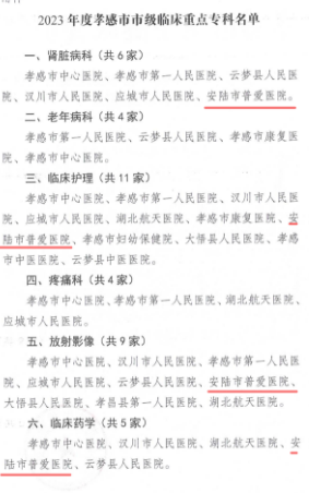 近日,孝感市卫健委下发《关于公布2023年度孝感市市级临床重点专科名单的通知》,安陆市普爱医院肾脏病科、临床护理、放射影像、临床药学、肛肠科、病案科、超声影像七个专科入选孝感市市级临床重点专科。