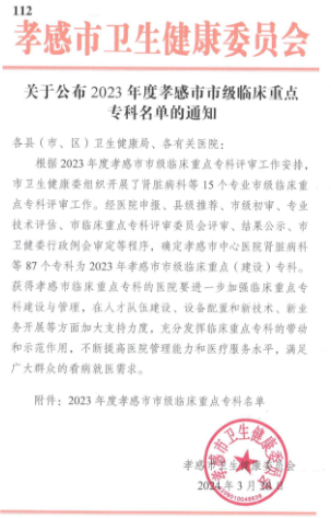 安陆市普爱医院肾脏病科等七个专业获得“2023年度孝感市市级临床重点专科”称号