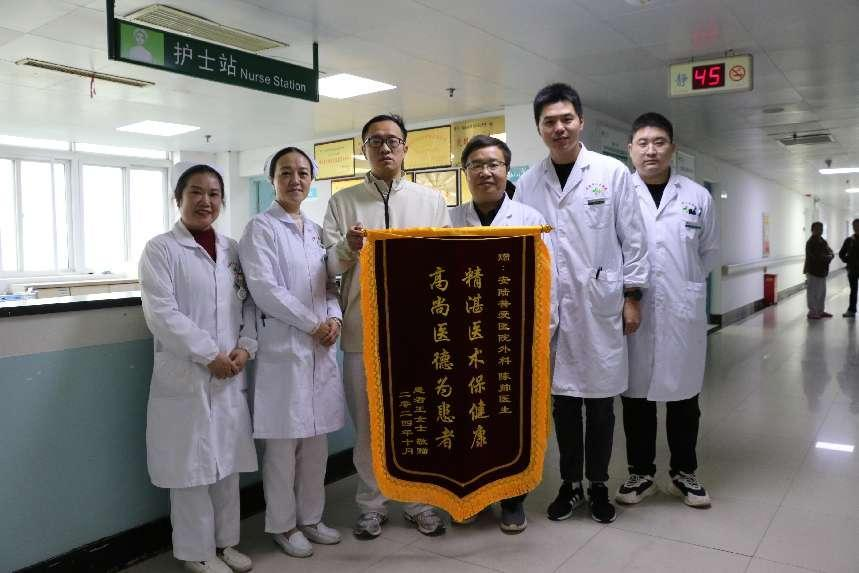 12月23日,黄冈市蕲春县的卫先生驱车3小时来到安陆普爱医院,向ICU医护人员送上“妙手神技 德艺双佳”的锦旗,表达对医护人员全力抢救挽回自己生命的感激之情。