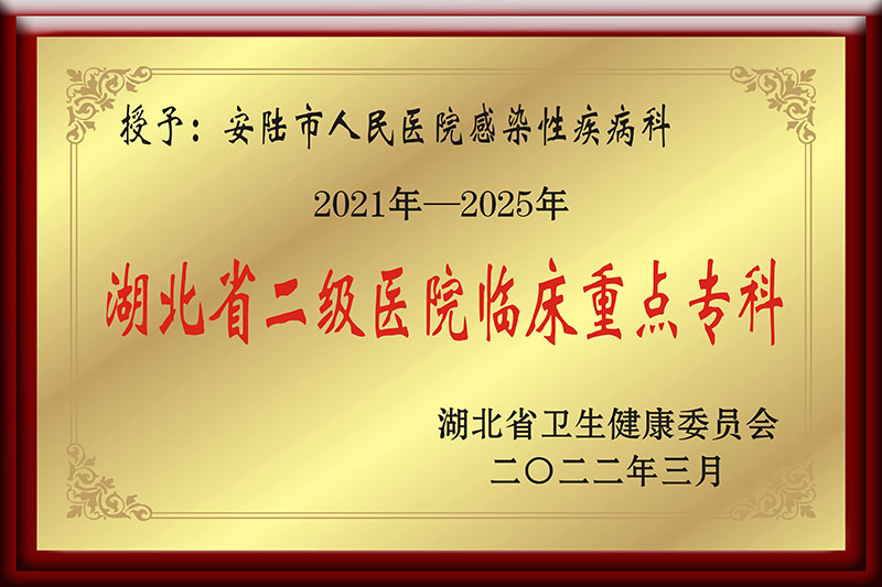 安陆市唯一指定感染性疾病定点救治单位、为艾滋病、肺结核定点救治及全程督导管理单位、武汉协和医院肝病联盟、武汉协和医院疑难危重肝病感染专科联盟单位、湖北省传染病专科联盟理事单位、孝感市临床重点专科、湖北省临床重点专科、安陆市青年五四标兵集体、安陆市抗击新冠肺炎疫情集体三等功、优质护理示范病房、工人先锋号单位。