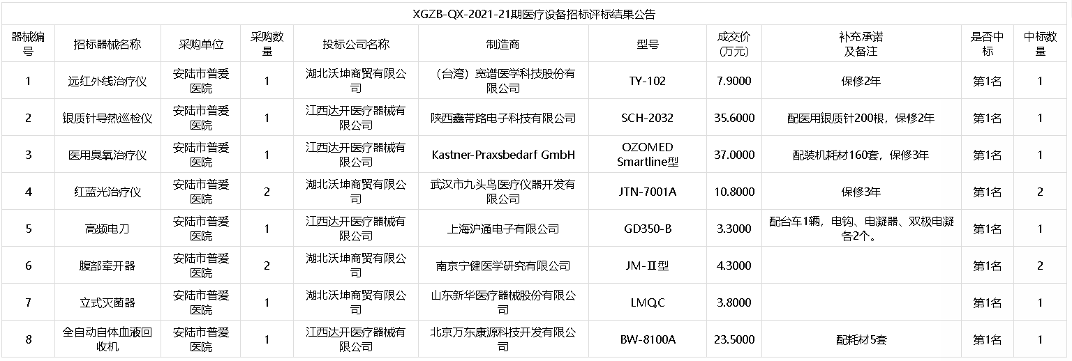 安陆市普爱医院2021年02期医疗设备招标采购中标结果公告