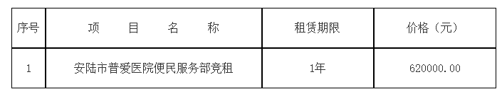 安陆市普爱医院委托安陆市冲之工程造价师事务有限责任公司,就安陆市普爱医院便民服务部的出租采用竞租的方式进行。现就本次竞租的成交结果通知如下: