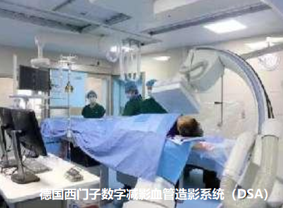 2、德国西门子数字减影血管造影系统(简称DSA)以及全套微创介入治疗设备:在医学影像设备的引导下,利用介入器械,主要是通过六大基本技术来对疾病进行诊断或治疗,包括 冠脉造影术、射频消融术、支架置入术、起搏器置入术、肝血管瘤介入术、脾脏部分栓塞术、支气管动脉造影+栓塞术、脑血管造影、取栓、溶栓术等介入技术